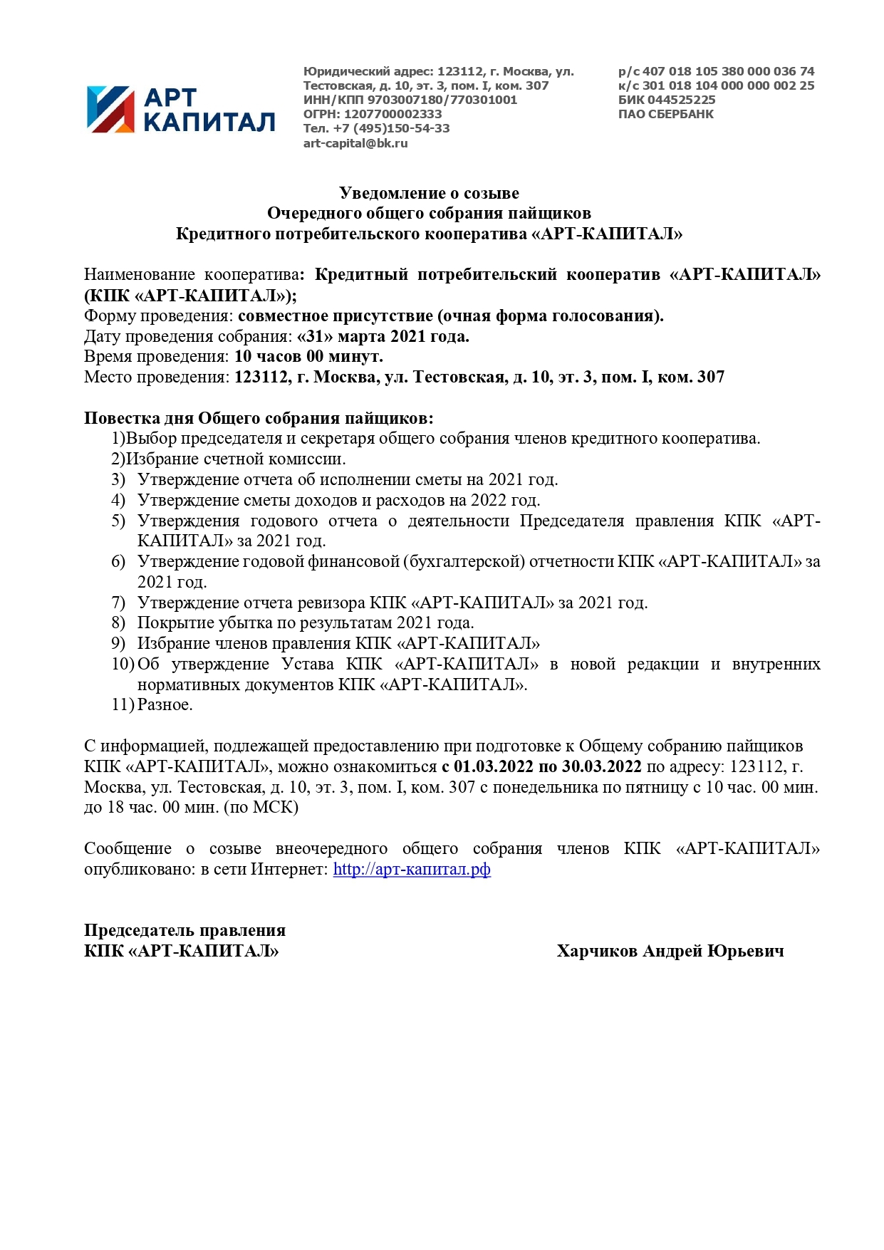 Уведомление о созыве Очередного общего собрания пайщиков КПК «АРТ-КАПИТАЛ» Дата собрания: 31.03.2022